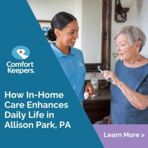 Comfort Keepers of Pittsburgh, PA is a locally owned in-home care provider serving Allison Park and surrounding communities. The organization is part of the nationally recognized Comfort Keepers network and was awarded the National Business Research Institute (NBRI) Circle of Excellence Award in 2018 for customer satisfaction.