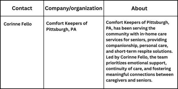 “Our goal is to support both the caregiver and the care recipient, helping families navigate the caregiving journey with confidence and peace of mind,” said Corinne Fello, owner of Comfort Keepers of Pittsburgh, PA. “We’re here to provide the care and compassion that allow both seniors and their families to thrive.”