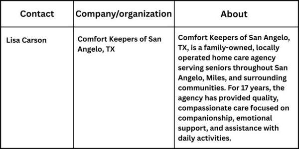Lisa Carson, owner of Comfort Keepers of San Angelo, TX, shared, “Our goal is to provide not just assistance, but meaningful connections that allow seniors to feel supported and part of a community. Trust and engagement are key to the care we provide.”