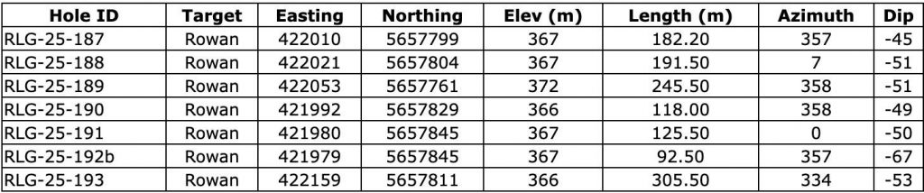 Will Robinson, Vice President of Exploration, stated, “It’s great to be back drilling at Rowan and we are very encouraged with the results from this first batch of assays. Our updated mineralized domain model that was completed in April 2024 has been holding true with veins and mineralized zones being intercepted where expected. The main targets for this program are Veins 001, 004, 006b and 013, but we are also intercepting mineralization along trend of other modeled veins in the system. These intercepts are expected to provide meaningful data points to inform an updated Mineral Resource Estimate (“MRE”) at Rowan planned for Q2 2026. Additionally, the larger diameter HQ drill core we are using for this program is providing excellent grade representation and larger volume samples, with instances of visible gold being commonly observed by the core logging geologists. Based on the early success in this program and the clear expansion potential at Rowan we have added an additional 1,000 m of drilling to continue extending the Vein 001 zone along strike to the west in areas previously un-drilled.”