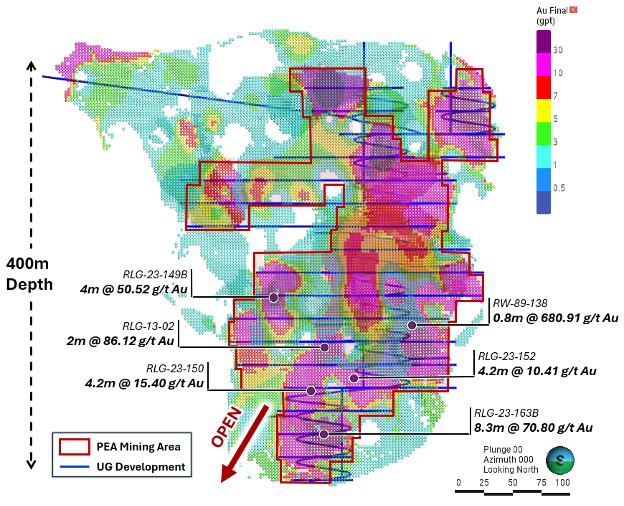 FIGURE 11. Long section of Rowan block model at 1 g/t Au cutoff showing PEA mine design (blue) and outline of areas planned for long hole stoping on Veins 001, 003 and 004 (red outline). Notable assay intercepts have been highlighted to indicate the strength of gold mineralization and expansion potential at depth. Intercepts are reported as core length unless otherwise stated [2].