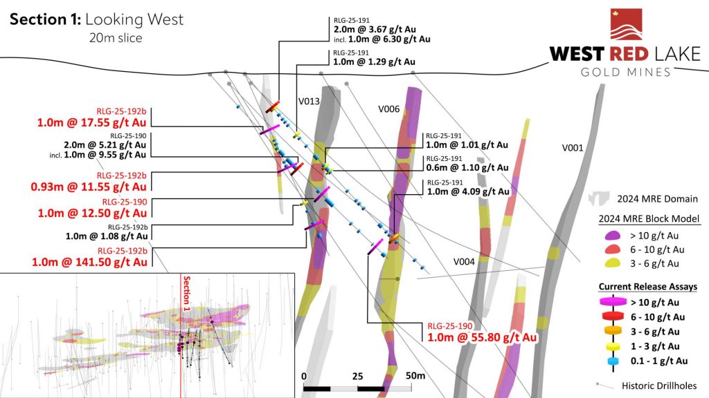 - Hole RLG-25-192b Intersected Vein 013 with 1m @ 141.5 grams per tonne gold (“g/t Au”), from 76.1m to 77.1m. This high-grade intercept was complimented by visible gold spatially associated with quartz veining and strong silicification (Figure 1). Hole -192b also intercepted Vein 011 with 1m @ 17.55 g/t Au, from 27.6m to 28.6m.
