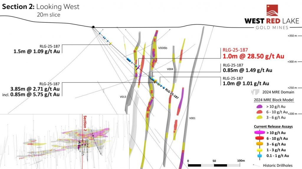 FIGURE 6. Rowan drill section showing assay highlights for Hole RLG-25-187[1].