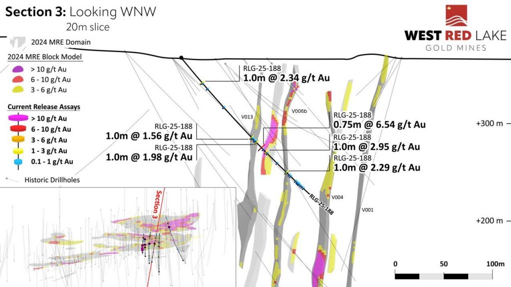 FIGURE 7. Rowan drill section showing assay highlights for Hole RLG-25-188[1].