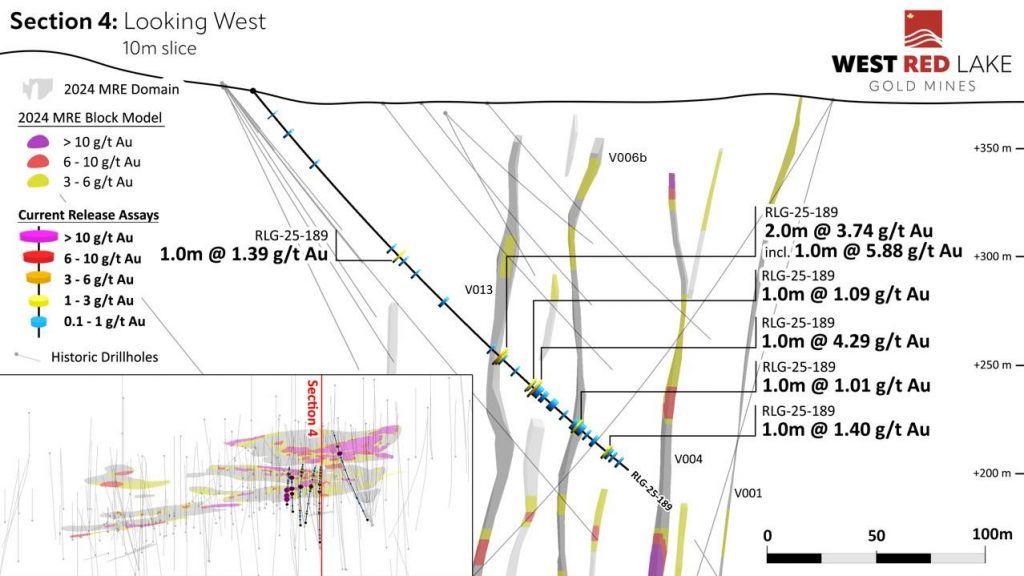 FIGURE 8. Rowan drill section showing assay highlights for Hole RLG-25-189[1].