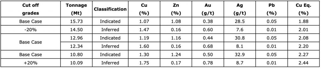 (3) The underground cut-off grade used (base case -20 %) is a value of 80 US$/t (after processing recovery, equivalent to 0.82 % Cu, or 2.80 % Zn, or 1.11 g/t Au or 115.1 g/t Ag).