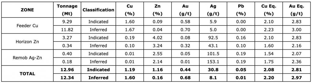 - Indicated resources contain 340 million pounds (“Mlbs”) Cu, 332 Mlbs Zn, 184 thousand ounces (“koz”) Au and 12.8 million ounces (“Moz”) Ag or 595 Mlbs of CuEq or 1.2 million ounces (“Moz”) AuEq.