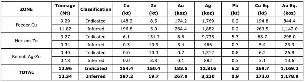 - Inferred resources contain 435 Mlbs Cu, 43 Mlbs Zn, 268 koz Au and 3.2 Moz Ag or 599 Mlbs of CuEq or 1.2 Moz AuEq.