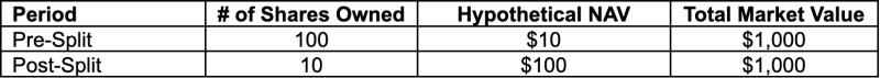 As a result of these reverse splits, every twenty, or ten shares of a Fund will be exchanged for one share as indicated in the table above. Accordingly, the total number of the issued and outstanding shares for a Fund will decrease by the approximate percentage indicated above. In addition, the per share net asset value (“NAV”) and next day’s opening market price will be approximately twenty, or ten-times higher for the Funds. Shares of the Funds will begin trading on their respective listing exchange (the “Exchange”) on a split-adjusted basis on March 5, 2026.