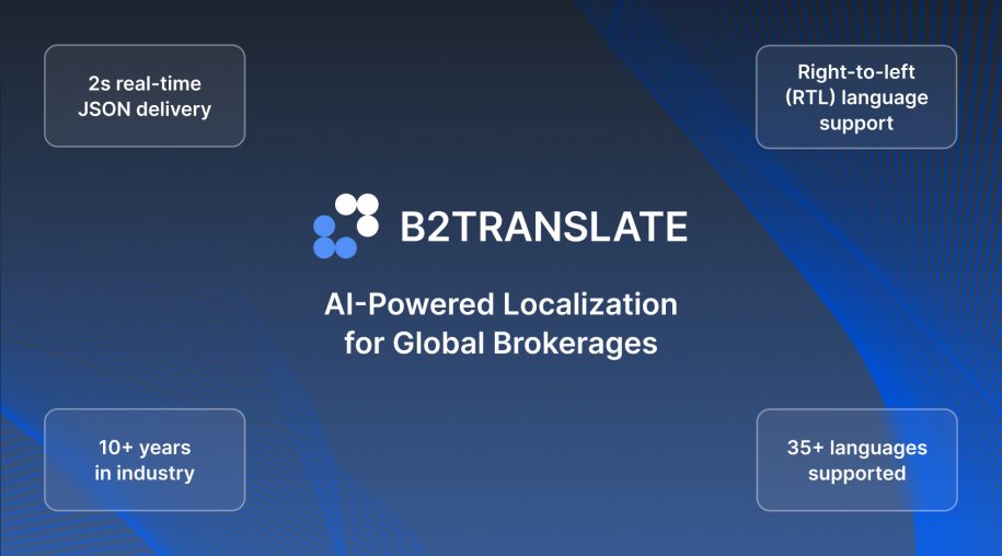 B2TRANSLATE is a localization platform designed to help brokers expand into global markets faster by removing language barriers at scale. It is built with an AI-first approach to deliver fast, high-quality translations out of the box. The service includes the ability to translate into any language, including the right-to-left ones, ensuring a solid user experience, no matter which part of the world they’re operating from.