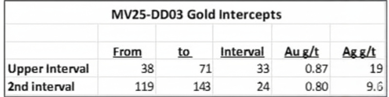 - MV25-DD03 intersected 33 meters at 0.87 g/t Au.