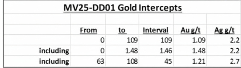- MV25-DD01 intersected 109 meters at 1.09 g/t, including 45 meters at 1.21 g/t Au.