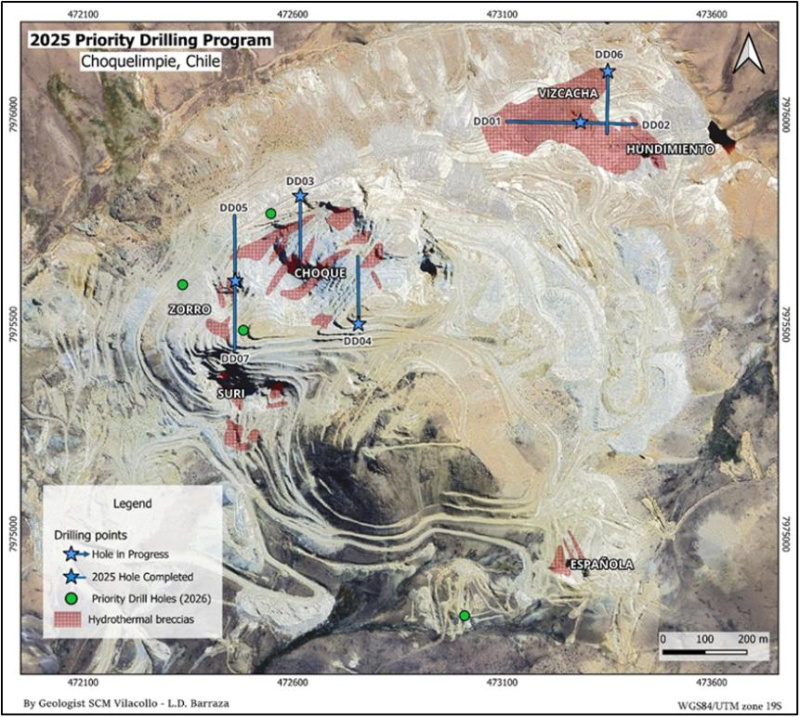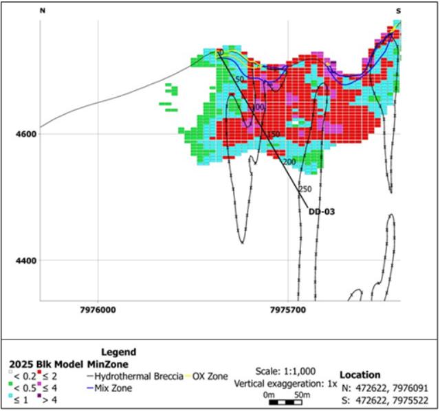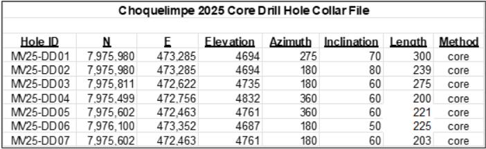 Hole MV25-DD03 has been drilled (depth of 275 meters) to explore the Choque Zone (Figure 1 & Table 1) at depth, below the area where higher gold grades have been calculated within the 2025 resource model (Wilson, 2025), (Figure 4). The hole intersected argillically-altered DAP.