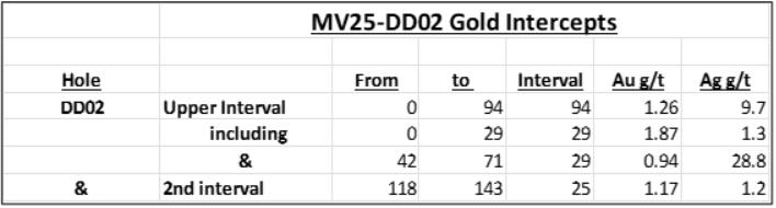 - MV25-DD02 intersected 94 meters at 1.26 g/t Au, including 31 meters at 1.79 g/t Au.