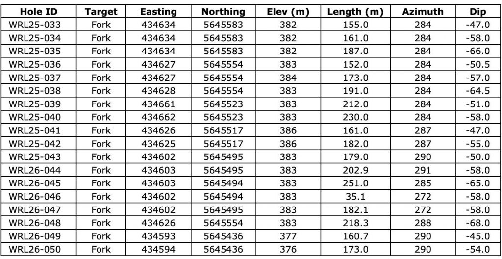 FIGURE 6: Fork drill section showing assay highlights for Holes WRL-25-033 through -035.