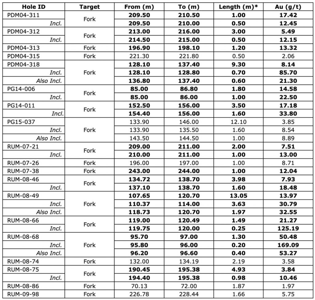 - Hole RUM-08-68 Intersected 1.3m @ 50.48 g/t Au, from 95.7m to 97.0m, Including 0.2m @ 169.09 g/t Au, from 95.8m to 96.0m, Also including 0.4m @ 53.27 g/t Au, from 96.2m to 96.6m.