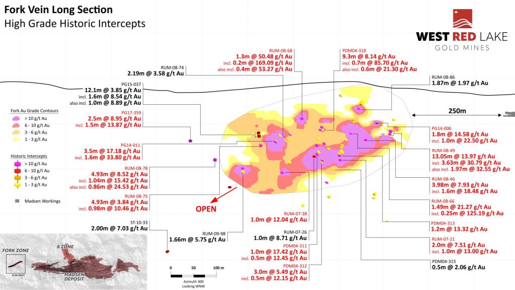 Shane Williams, President and CEO, stated, “Successful completion of the infill drilling program at Fork was an important step in de-risking this resource area ahead of a construction decision. The results of the drill program are very encouraging and further support the gold grade and vein continuity at Fork which will be necessary for efficient mine planning and any future extraction scenario. The engineering team at Madsen is already working on the initial mine design for this satellite area, and we look forward to continuing to evaluate this non-remnant, near surface opportunity which currently sits a mere 250 metres from our existing underground infrastructure.”