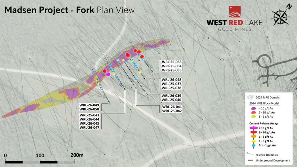 West Red Lake Gold Mines Ltd.(“West Red Lake Gold” or “WRLG” or the “Company”) (TSXV:WRLG)(OTCQB: WRLGF) is pleased to announce results from the infill drilling program at its 100% owned Fork Deposit located approximately 250 metres (“m”) southwest from its Madsen Mine in the Red Lake Gold District of Northwestern Ontario, Canada.