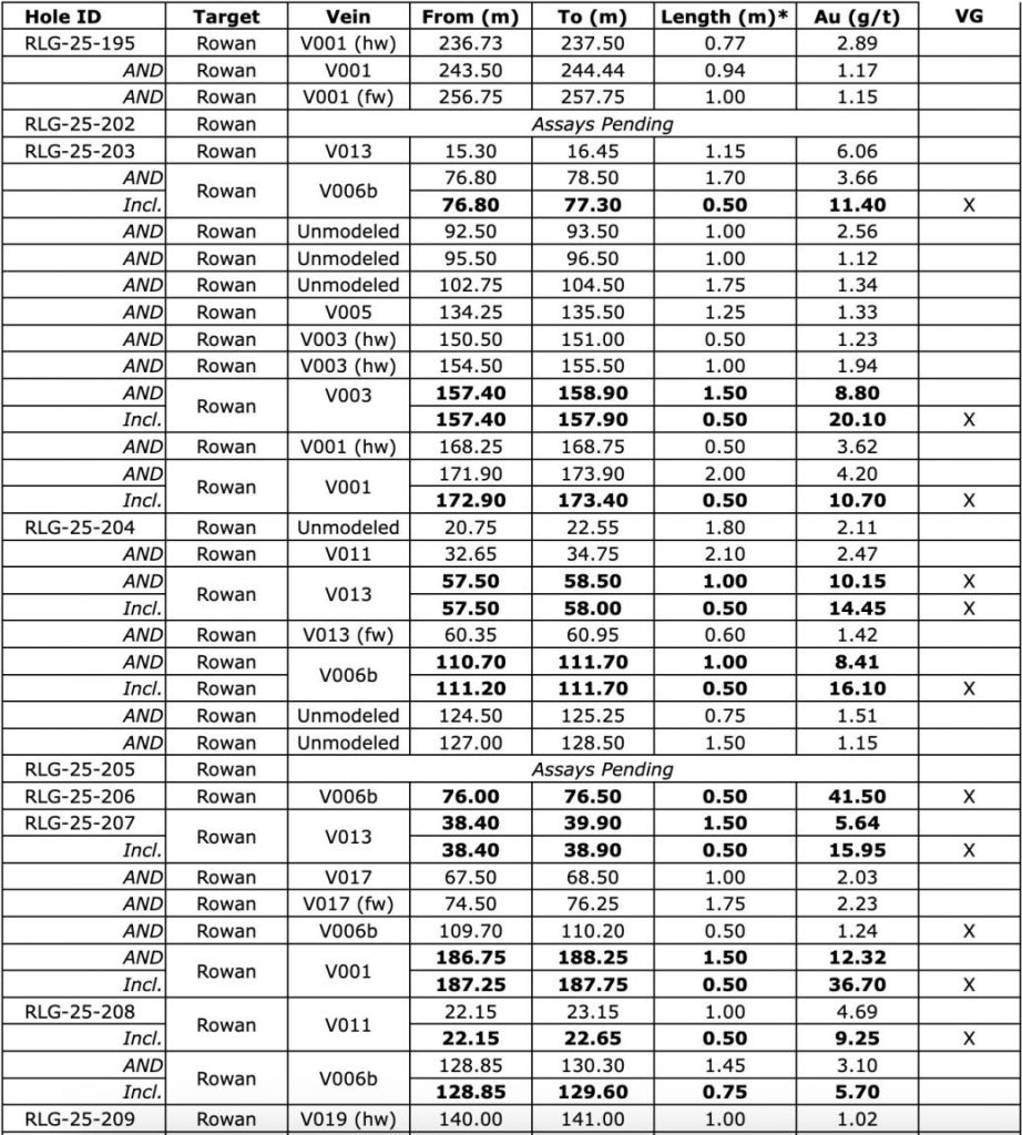 - Hole RLG-25-207 Intersected Vein 001 with 1.5m @ 12.32 g/t Au, from 186.75m to 188.25m; Including 0.5m @ 36.70 g/t Au, from 187.25m to 187.75m. This intercept was complimented by visible gold spatially associated with quartz veining and was along the western margin of the currently modeled V001 domain.