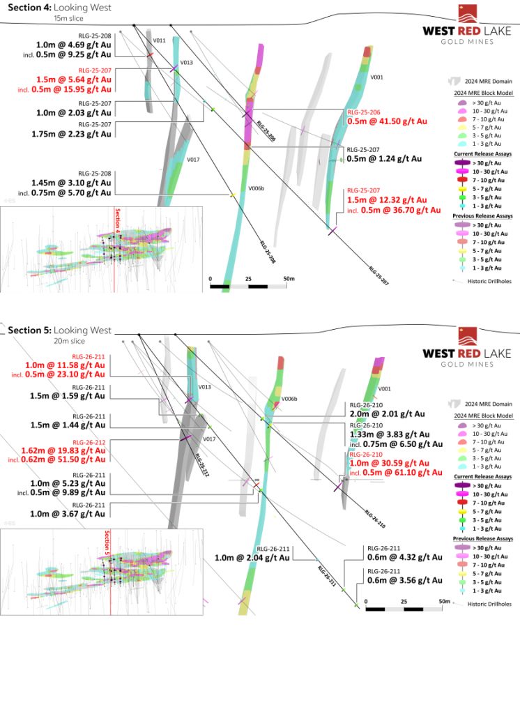 - Hole RLG-26-212 Intersected Vein 013 with 1.62m @ 19.83 g/t Au, from 73.15m to 74.77m; Including 0.62m @ 51.50 g/t Au, from 74.15m to 74.77m. This intercept was complimented by visible gold spatially associated with quartz veining.
