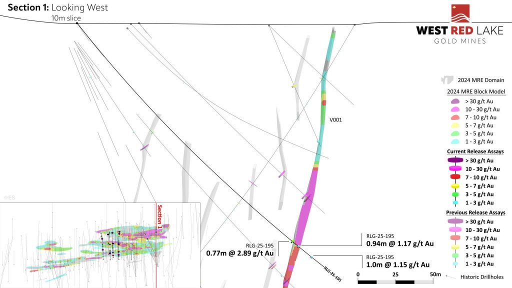 FIGURE 5. Rowan drill section showing assay highlights for Hole RLG-25-195[1].