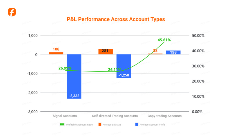 Copy-trading accounts that follow trades from open to close achieve the highest percentage of profitable accounts and overall gains. Self-directed trading accounts maintain a moderate number of profitable accounts with average losses, while signal accounts record the lowest proportion of profitable accounts and the largest overall losses.