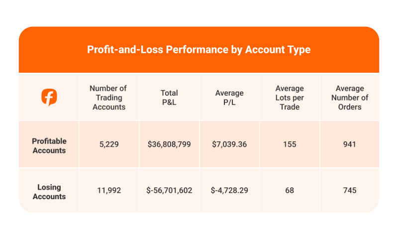 The table shows fewer profitable accounts than losing ones, resulting in a net market loss. Profitable accounts earn more on average than losing accounts lose, with higher trade volumes and order counts, showing activity and scale positively correlate with profitability.