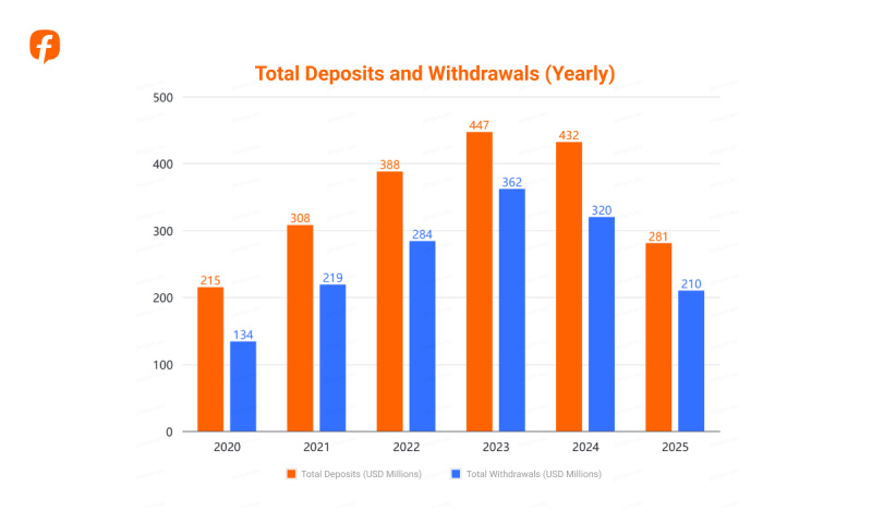 In 2025, total deposits by active accounts declined by 34.95% year-on-year, while total withdrawals decreased by 34.38%. The average deposit per account was $10,285, and the average withdrawal was $8,471, with the ratio of accounts with withdrawals to those without at approximately 2.43:1.