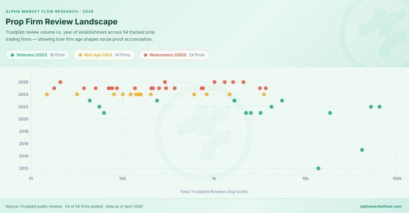 To test this, Alpha Market Flow analyzed 54 prop trading firms and over 235,000 Trustpilot reviews primarily from April 2025 to April 2026.