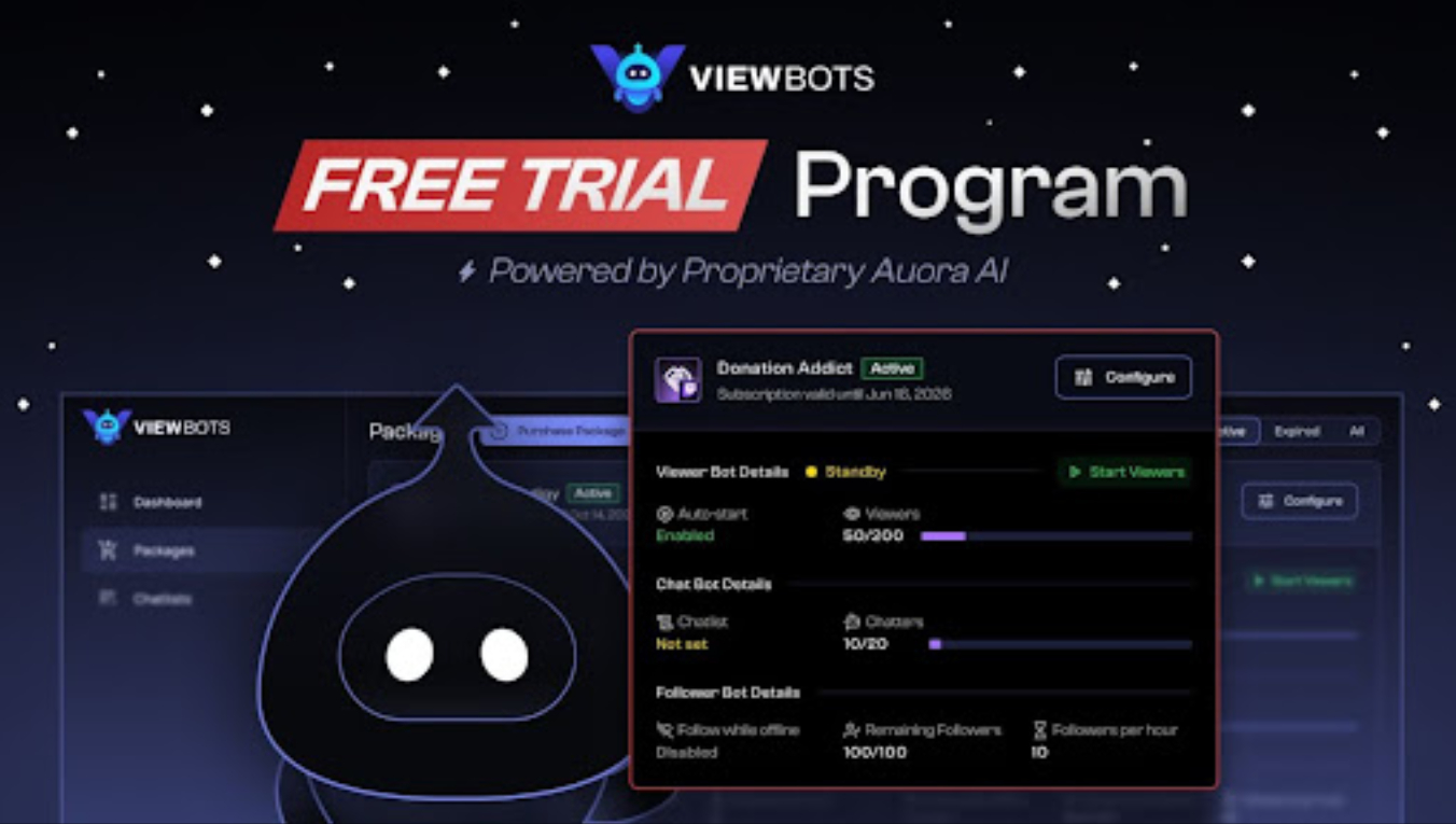 ViewBots.com Start Free Trial Program, Powered by Proprietary Aurora AI, Revolutionizing Streamer Growth with Undetected, Organic Solutions
